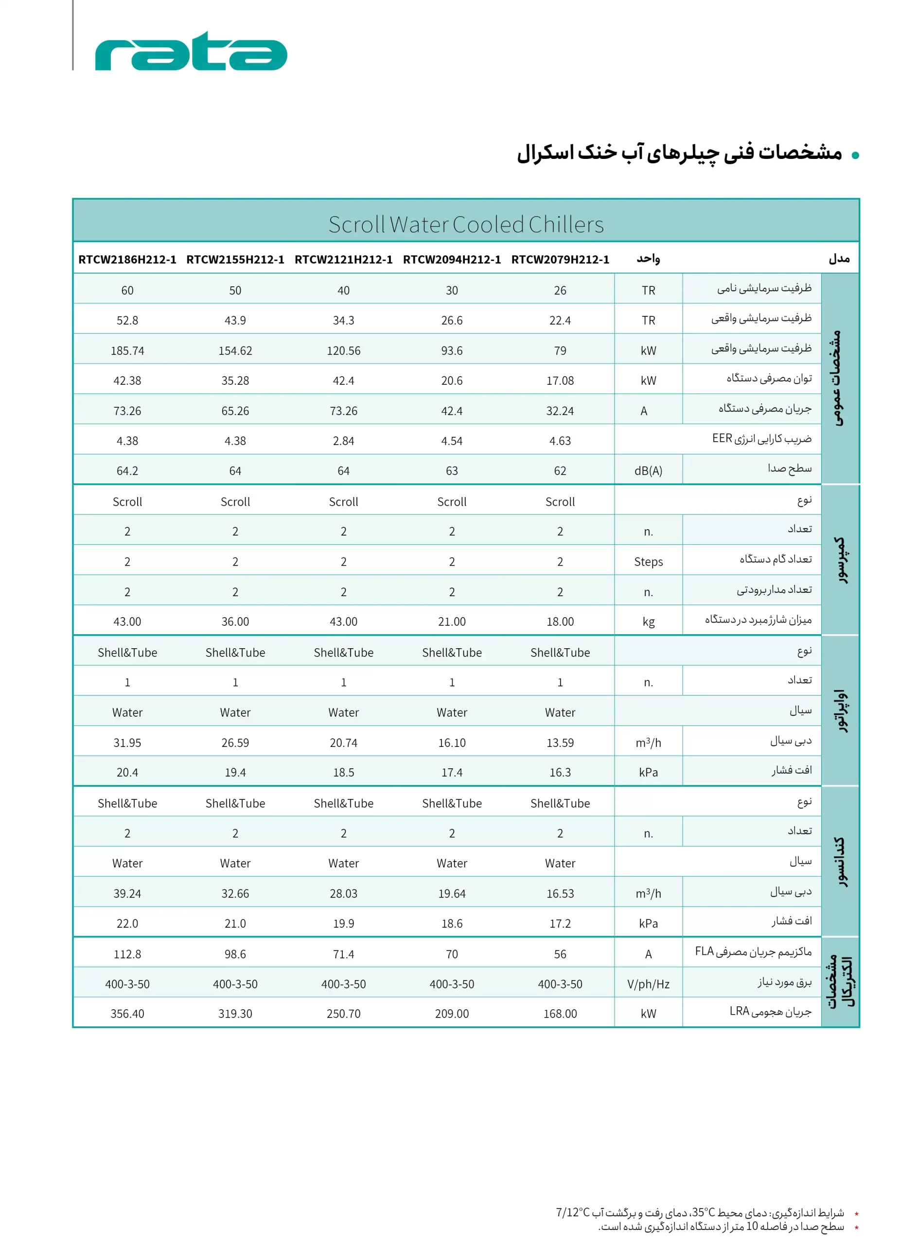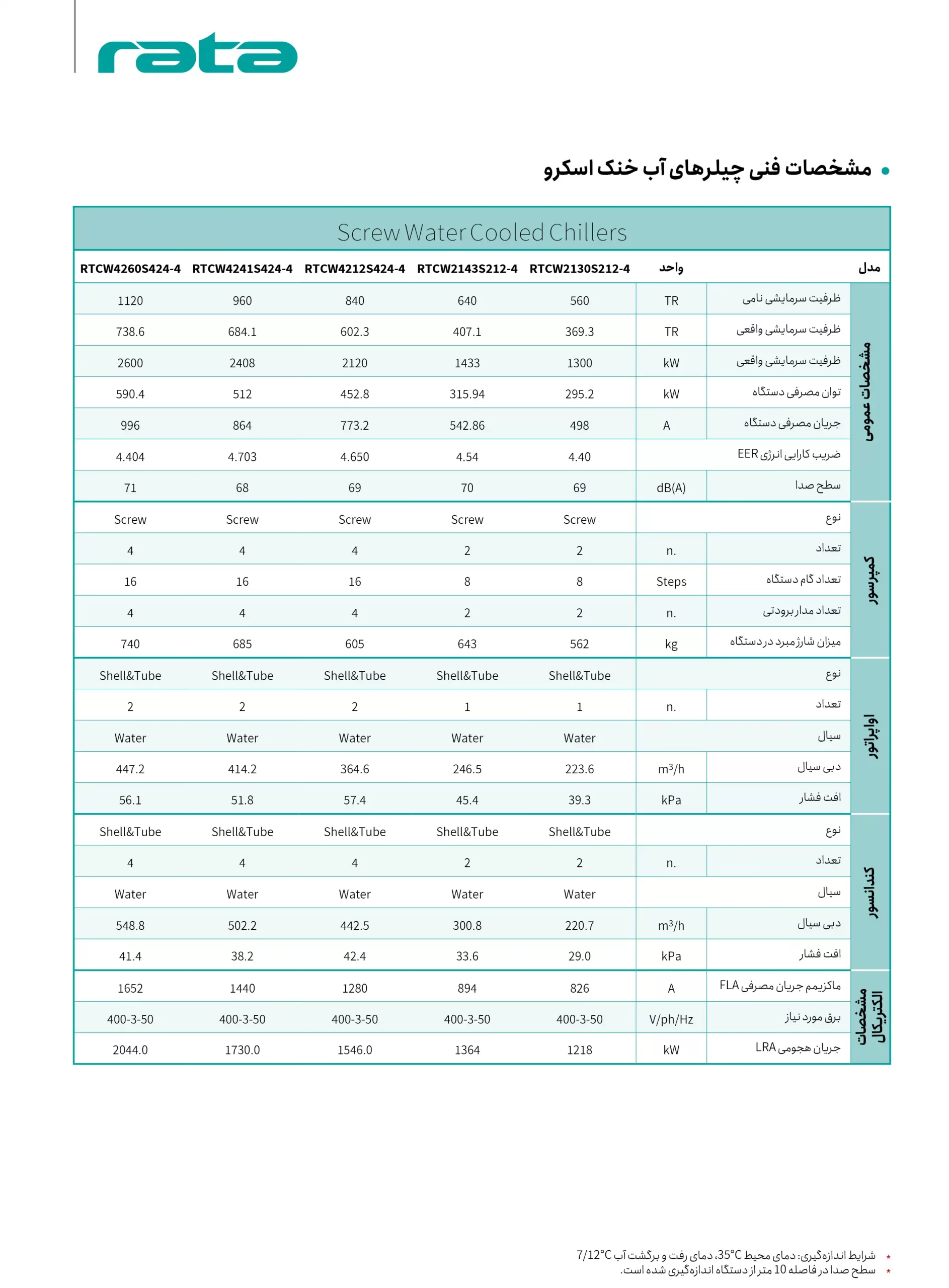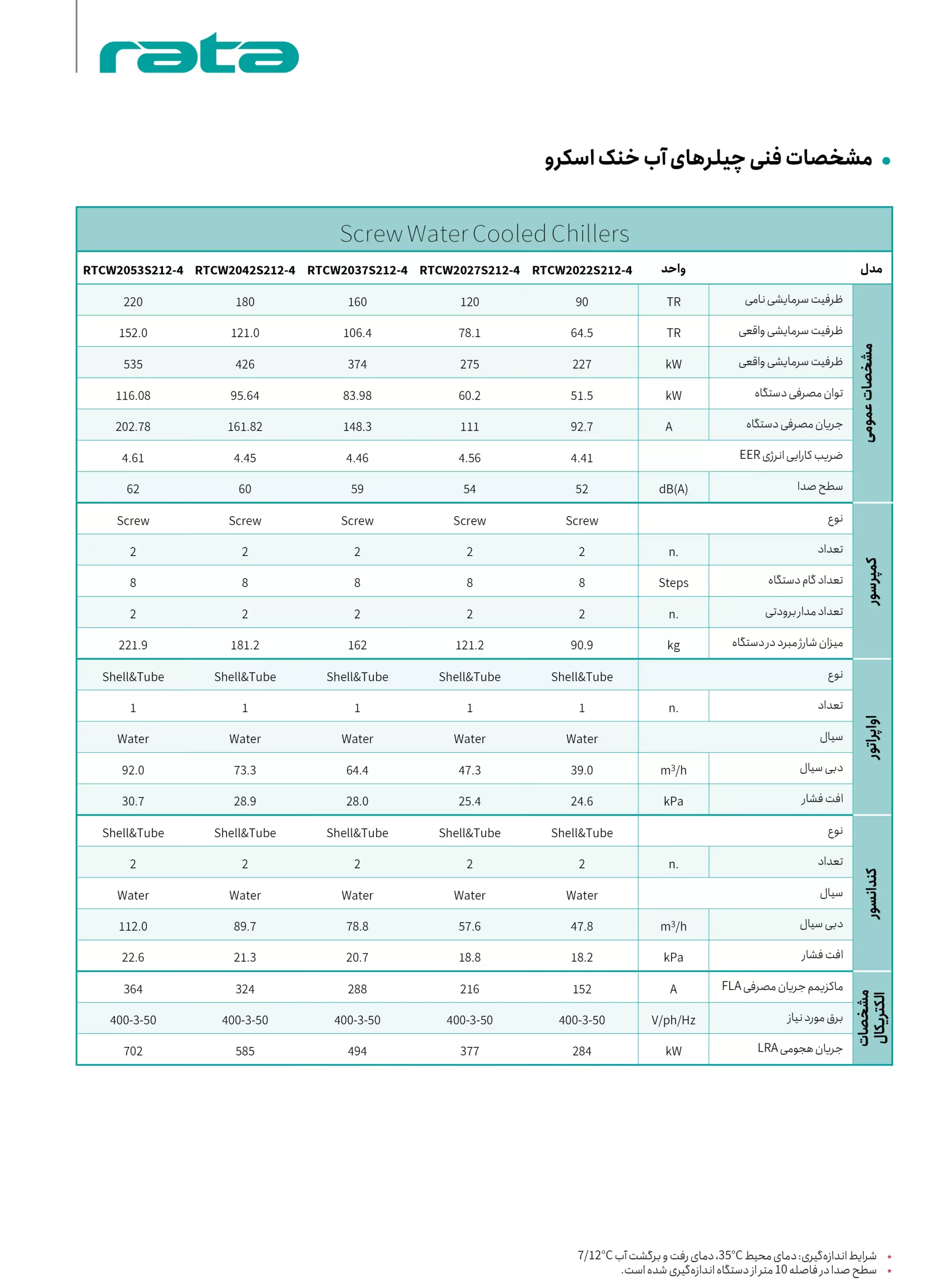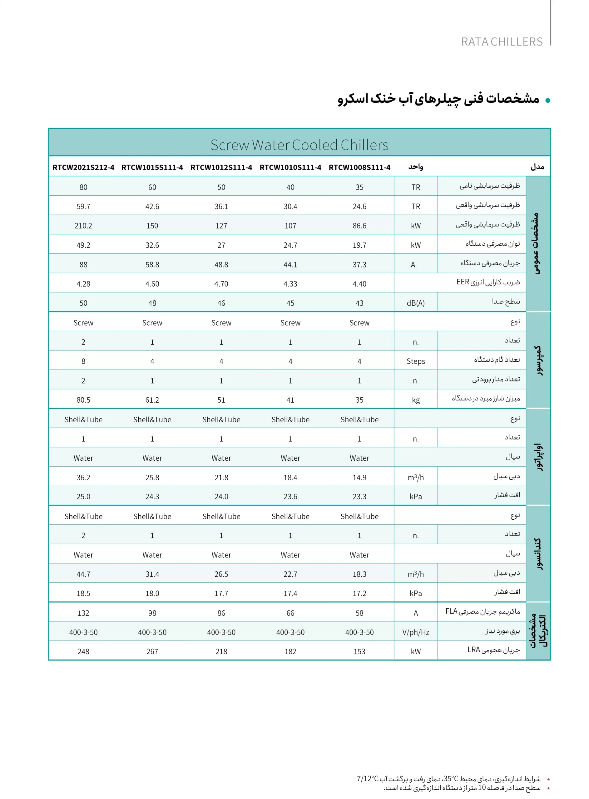 مشخصات فنی چیلرهای آب‌خنک اسکرو راتا ظرفیت 35 تا 80 تن تبرید